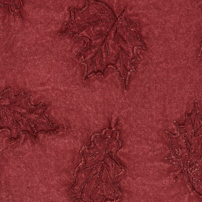 A cotton-linen blend kitchen towel from our Fall & Harvest Collection displaying blush inspired autumn red color and a falling leaf designs all over towel made with stitched and yarn details for added dimension. Kitchen towel is stonewashed for a naturally aged appearance. Our Falling Leaves kitchen towel is conveniently machine-washable for easy cleaning. Packaged on a cardboard hanger with hole to easily display on rack. A stylish fall-themed kitchen accessory perfect for seasonal use.