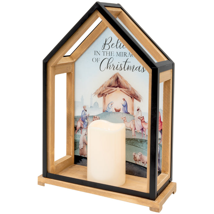 These Lanters are made from quality wood with metal accents. The flameless LED candle features a built in automatic timer; 6 hours ON/18 hours OFF. 3 AAA batteries are not included. These lanterns are intended for indoor use onlyW: 9"H: 14"D: 4"