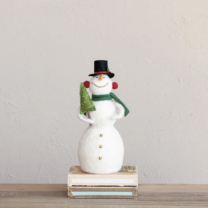 This wool snowman with Christmas tree is a lovely and adorable accessory that can enhance the home. It features a soft wool snowman with a Christmas tree, multicolor details, and a round shape, giving it a colorful and cozy look. The snowman has a smiling face and a hat that add some detail and charm to its appearance. The snowman also has a green Christmas tree that adds some contrast and sparkle to its appearance. This wool snowman with Christmas tree is a cozy and festive piece that can add some warmth and cheer to any decor style, from country to Scandinavian. It is ideal for creating a merry and bright atmosphere in the home, where it can make any space feel more festive and cheerful. It is made of wool and polyfoam, which are durable, smooth, and easy to clean. It measures 5.5 inches in diameter and 13.75 inches in height, making it a noticeable and attractive accessory. This is a perfect choice for anyone who loves lovely and adorable home decor. A soft wool snowman with a Christmas tree, multicolor details, and a round shape. A cozy and festive piece that can add some warmth and cheer to any decor style, from country to Scandinavian. Ideal for creating a merry and bright atmosphere in the home, this wool snowman with Christmas tree can be placed on a table, a shelf, or a mantel.