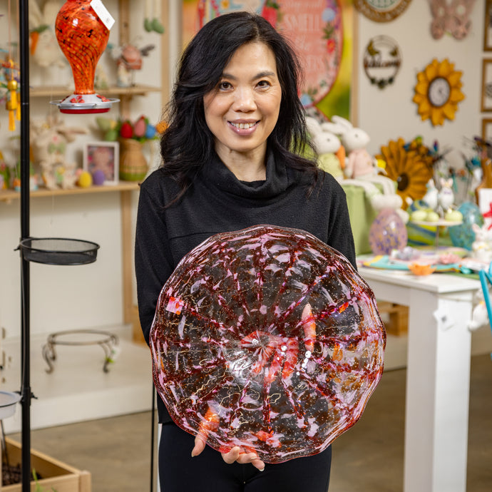 This glass bird bath will add color to any garden year-round while attracting birds from near and far with its stunning design. The bird bath showcases a stunning tie dye design. Crafted from durable glass, the bowl is outdoor safe and fade-resistant to ensure it stays vibrant season after season. The bird bath holds up to 42 ounces of liquid. It's perfect for every season, making it a gorgeous addition to any garden. Stand sold separately.