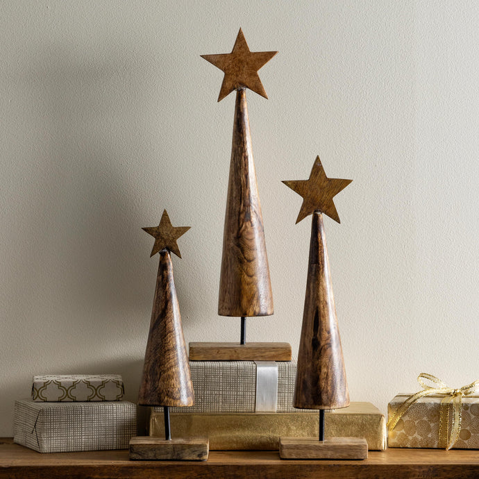 Elevate holiday decorating with this set of nature-inspired Wooden Christmas Trees. Their minimalist, neutral designs are perfect for adding a natural feel to any space with their gorgeous tone and wood grain. Decorated with stars on top, this set is ready to be displayed on a table, counter, mantel and more.