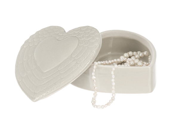 A charming little keeper for your most treasured trinkets! This heart-shaped box features an embossed wing lid that adds a touch of whimsy and elegance. Perfect for storing jewelry, keepsakes, or small mementos, it's sized just right for a nightstand, dresser, or shelf. At 4¼" wide by 4" deep by 1⅞" high, it's compact enough to tuck anywhere yet spacious enough to hold what matters most. A delightful gift for anyone who loves a bit of magic in their everyday moments.