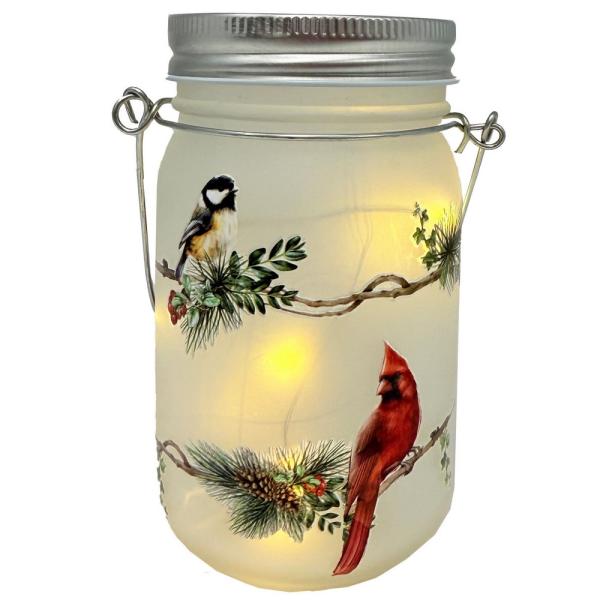 Our pretty frosted glass canning jar features a variety of popular backyard birds perched on pine and berry boughs. LEDs are built into the silver lid.