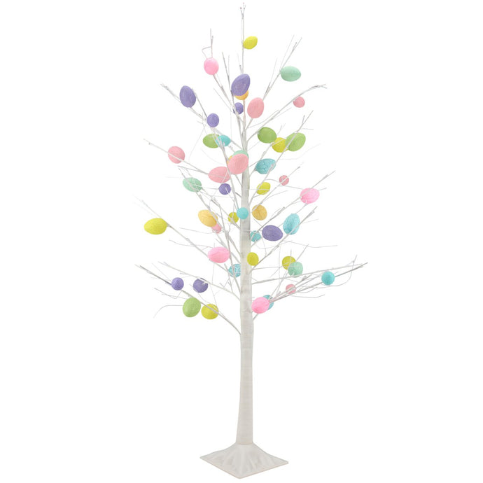 A lighted tree from our Easter & Spring Collection featuring a white tree design with various Easter egg lights throughout. Easter egg tree is 47 inches tall with 120 lights throughout the textured eggs and twigs. Our Lighted Easter Egg tree is designed for indoor use and is powered by outlet with 10 foot cord. Tree lights feature a convenient 6 hour timer and automatically turns back on after 18 hours if plugged into an outlet. A fun Easter home accent perfect for adding mood lighting to seasonal displays.