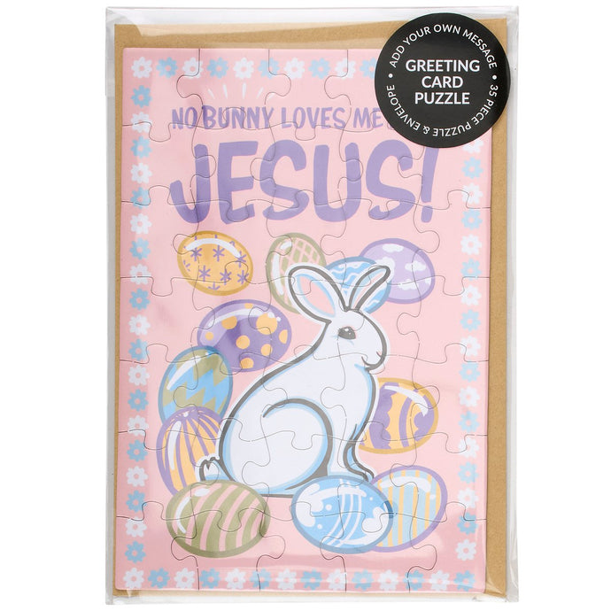 A greeting card puzzle from our Easter & Spring Collection combining the excitement of receiving a greeting card with the joy of completing a puzzle. This Easter puzzle card includes a blank space on the back to write a personal message, or express creativity in any way, before breaking up the puzzle for someone special to piece together the fun inside! We get them started with a colorful Easter inspired design on the front featuring playful hand illustrations of a white bunny and Easter eggs under a fun faith inspired sentiment that reads "No Bunny Love Me Like Jesus!" After personalizing the back, break up the 35 piece puzzle and place the pieces in the included kraft envelope. Our No Bunny Loves Me Like Jesus puzzle card and envelope is packaged in a polybag with an insert displaying easy-to-follow instructions. Due to the shape and weight, extra postage is required when mailing puzzle cards. A joyful greeting card that offers a fun alternative for Easter baskets and seasonal gifting.