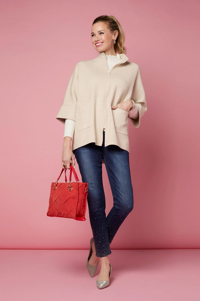 Charming square tote made of soft, brushed fabric. Front panel features a quilted design. Open interior with organization. Dual top handles, metal grommet and chain accents. Adjustable crossbody strap.