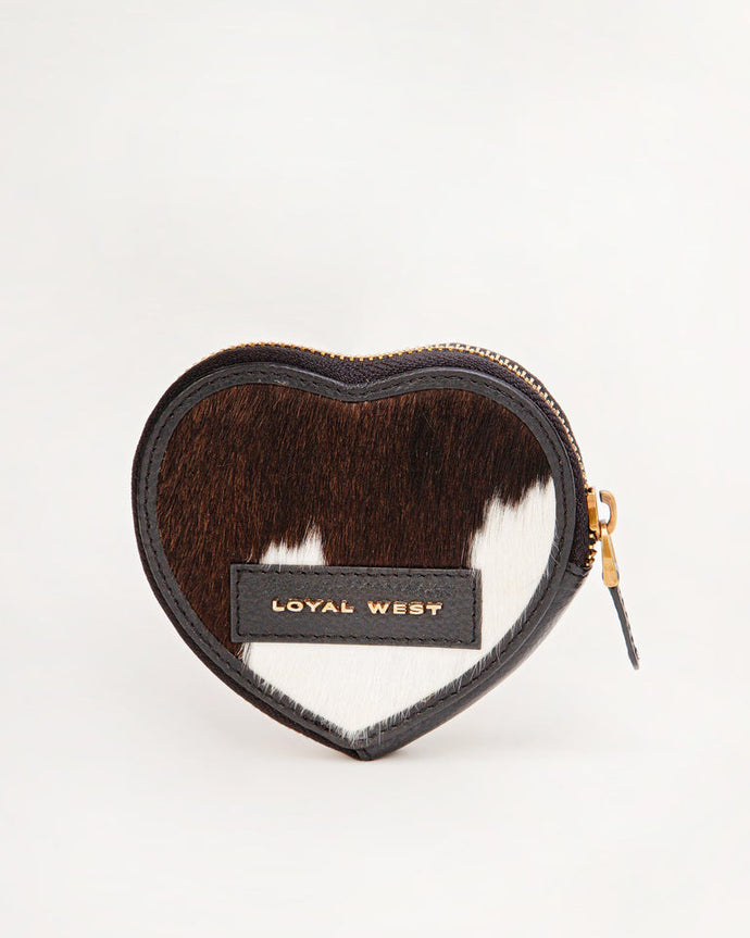 The Cupid Coin Pouch is a charming and compact accessory, crafted from premium black and white cowhide with a full hair-on design. Shaped in the form of a heart, this small coin purse or wallet adds a playful yet elegant touch to your essentials. Perfect for carrying coins, cards, or small items, it combines unique style with practicality. Its heart-shaped design and hair-on leather make it a standout accessory that adds a bit of love and personality to your daily carry.