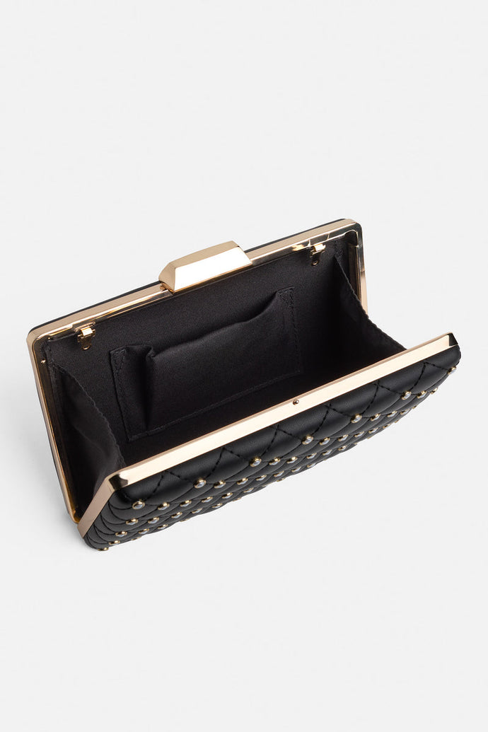 Perfect for the holiday season, this clutch has a fabric lining and detachable chain-link strap.