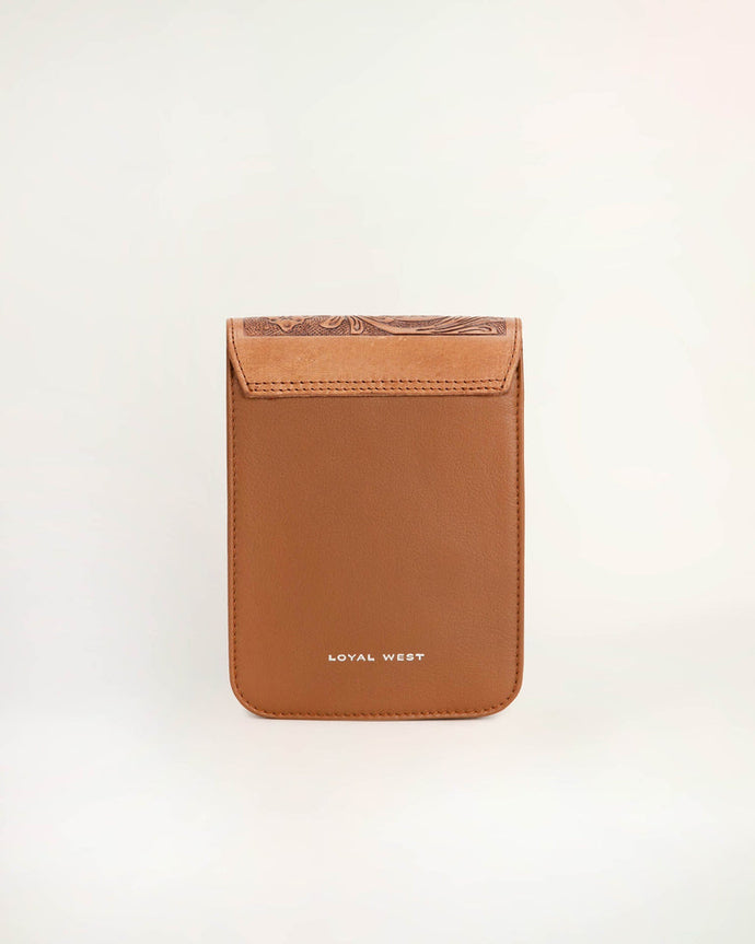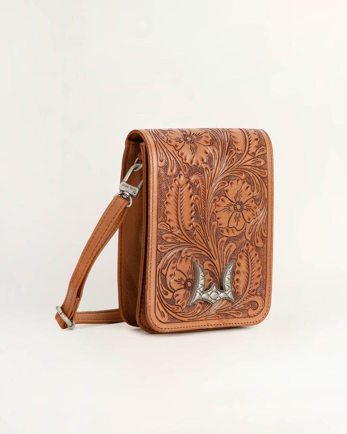 The Drover Mini Bag in brown handtooled leather and calfskin combines rugged craftsmanship with modern style. The intricate handtooled details add texture, while the smooth calfskin ensures durability.This crossbody bag is compact yet functional, with an adjustable strap for a comfortable fit. The rich brown color adds a timeless, western-inspired touch to any outfit.