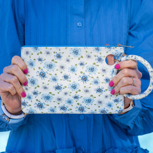 The Large Pouch - Fifty States Blue Silicone is where practicality meets artistry, offering a bloom of function and style. Featuring a beautifully intricate hydrangea-inspired design, this pouch is more than just a storage solution—it’s a work of art. Look closely, and you’ll see that the floral print is uniquely crafted from the shapes of all 50 states, seamlessly woven together into a stunning botanical motif.