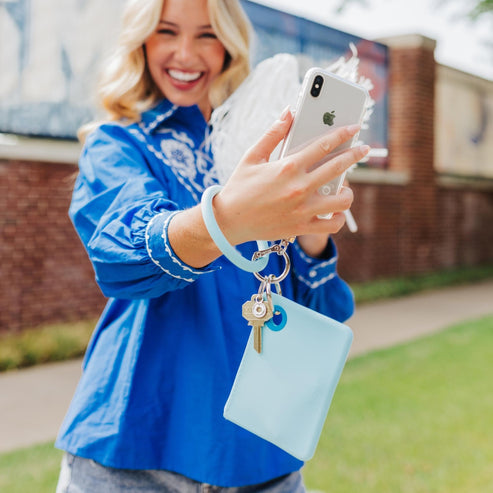 The zippered closure ensures your items stay secure, while the carabiner attachment allows you to easily clip the pouch to your bracelet keychain, bag, or keys for hands-free convenience. Whether you're heading to brunch or on the go, the Sweet Carolina Blue Mini Pouch is the perfect accessory to keep your essentials organized with a hint of charm.