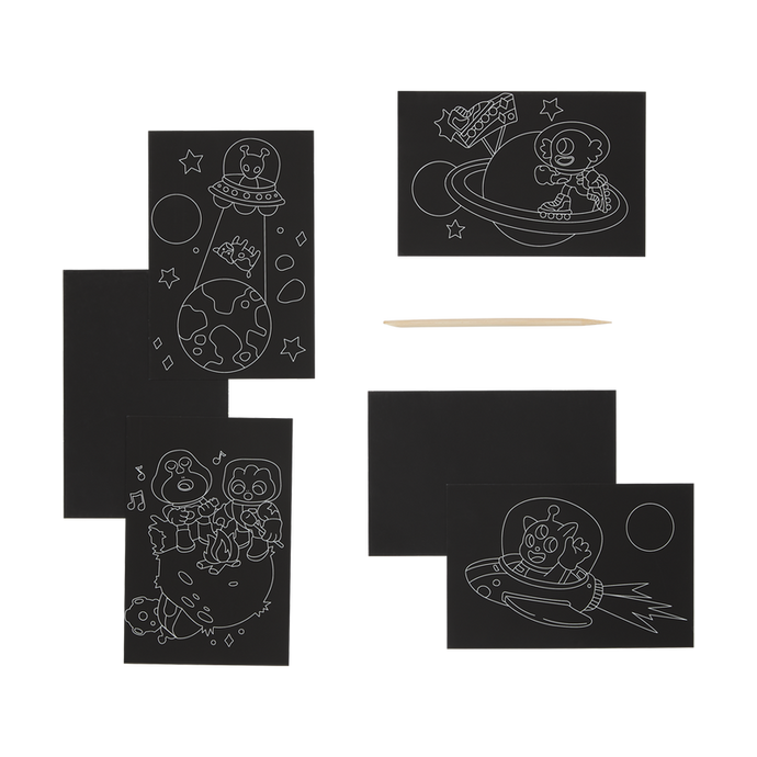 Give the gift of happiness that’s as amazing as the galaxy! The Galaxy Astronauts Happy Pack features a set of 3 multi-colored astronaut erasers, stackable, star shaped crayons in twelve colors, and scratch-and-sniff grape galaxy stickers - all in an easily giftable pack! From a galaxy far far away, comes an out of this world space themed Happy Pack. This giftable activity pack comes with a set of 3 multi-colored astronaut erasers that blast mistakes off your page and into orbit. Star-shaped stackable crayons provide coloring fun in twelve shades to keep your little astronaut occupied while circling earth. And a set of funny, alien-themed scratch art cards. This giftable bundle comes in a zippered pouch, complete with gift tag, for super simple gifting, no matter what planet you’re from.