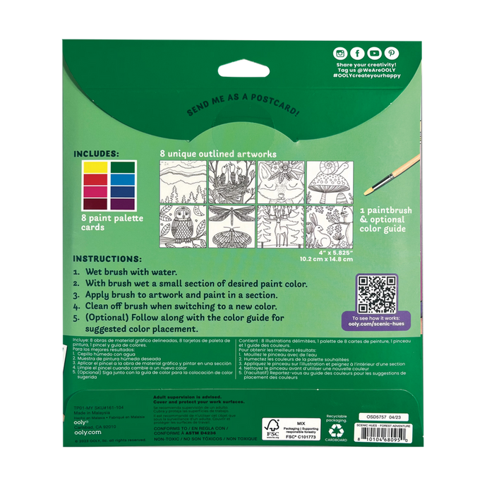 From the majestic evergreens, to baby birds tweeting in their nest, to owls perched high above the forest floor - the beautiful scenes are all there in this watercolor art kit, just waiting for your child’s colorful interpretation! With eight different forest themed outlines, eight coordinating color palettes, a paint brush, and an optional color guide, your budding artist will have everything they need to begin creating their very own watercolor paintings. Each watercolor paint card can be used as a postcard, so when your kiddo is finished, they can mail their masterpieces out to friends and family. These can also be used as perfectly sized, unique invitations!
