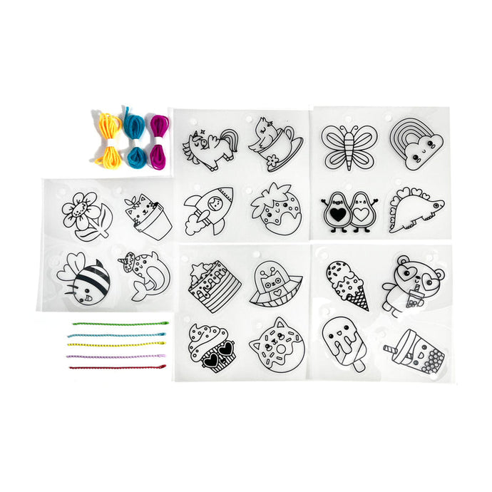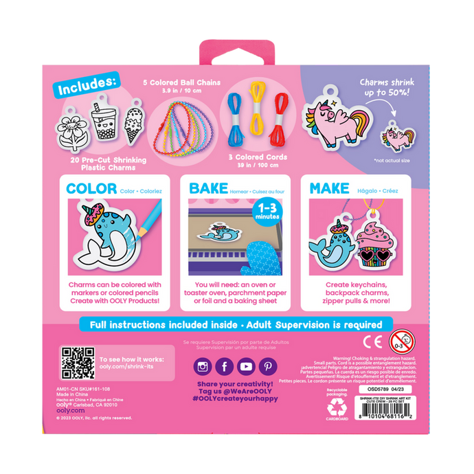 Your crew of cuties awaits in this shrink art kit. It has everything you need to create a fun charm to put on your keychain, backpack, or door! Just color in the included charms, watch them shrink down in an oven, and attach them to the cord or ball chain provided in the kit!