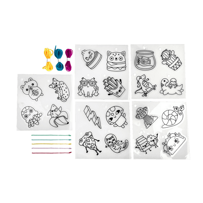 - Kit includes 20 pre-cut shrink plastic charms, 5 ball chains in red, yellow, green, blue, and purple, and 3 packs of cord in blue, yellow, and red