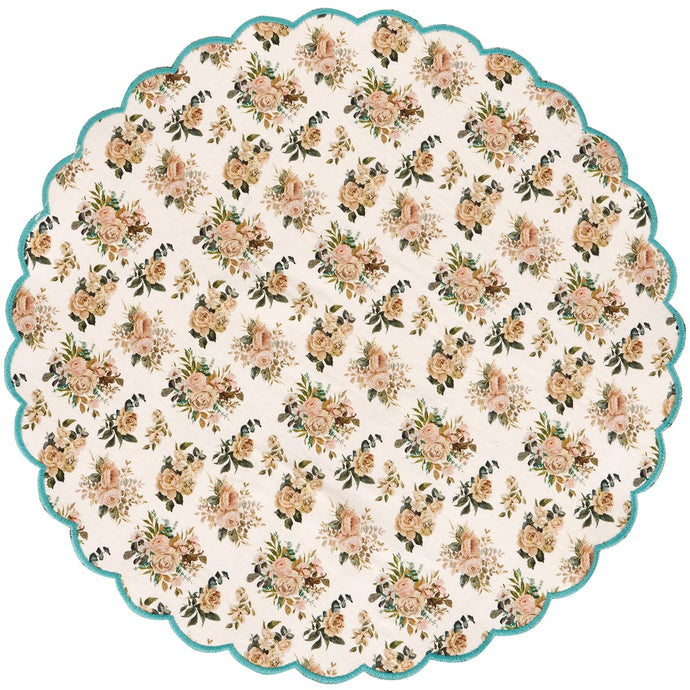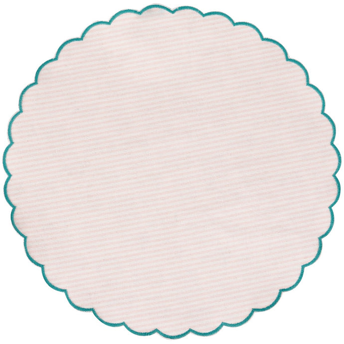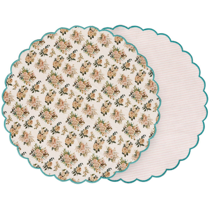A double-sided cotton placemat from our Watercolor Collection displaying a pattern of cabbage roses on one side and light pink stripe pattern on the other side with coordinating scalloped edge made with blue thread. Designs are replicated from original art hand painted in a unique watercolor style. Our Cabbage Rose cotton placemat set is conveniently machine-washable for easy cleaning. A stylish tabletop accessory perfect for customizing everyday place settings.