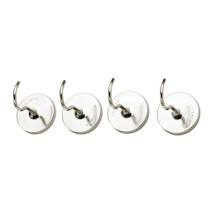 Made from chrome-plated steel for durability; strong magnets for a firm hold; complements any decor; set of 4 hooks (each measures 1.25 x 1.5-inches)