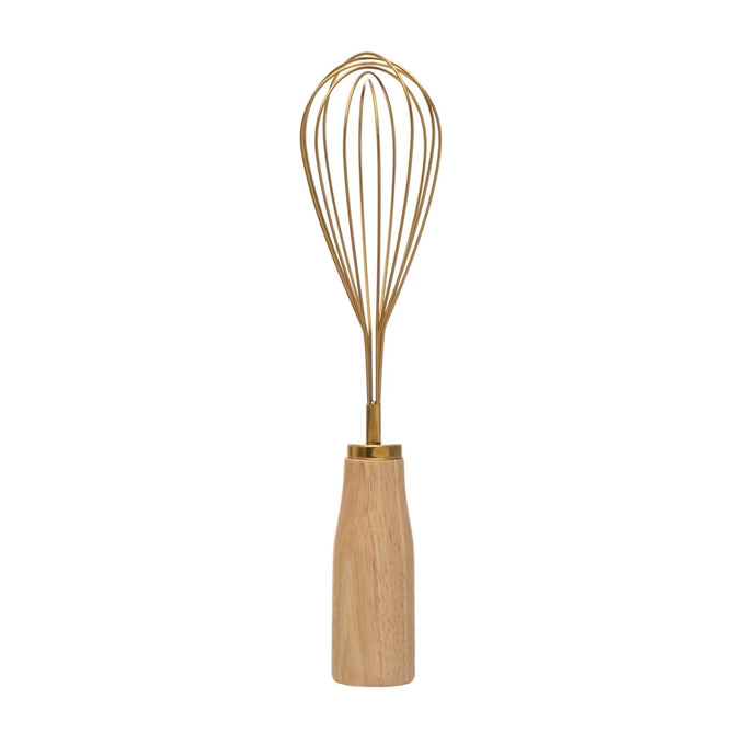 This swanky and stylish standing stainless steel whisk with gold finish and a wood handle makes cooking look trendy. It effortlessly adds a touch of glam to meal prep and cooking style, making cooking fun. The wooden handle has a flat base that keeps this whisk upright and ready for whipping up something yummy.