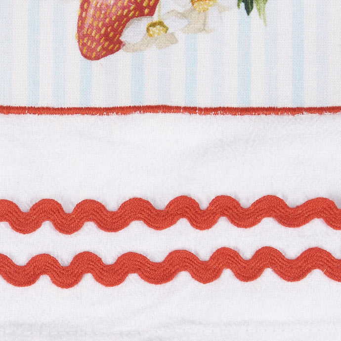 A cotton kitchen towel from our Garden Collection featuring a stitched art panel with embroidered red trim displaying a hand painted wild strawberry design with coordinating light stripe background. Towel also features a red rickrack trim along bottom of towel. Our Strawberry Vine kitchen towel is machine-washable for convenient cleaning. Packaged on a cardboard hanger with hole to easily display on rack. A charming strawberry-themed kitchen accessory perfect for everyday use.