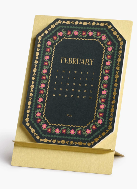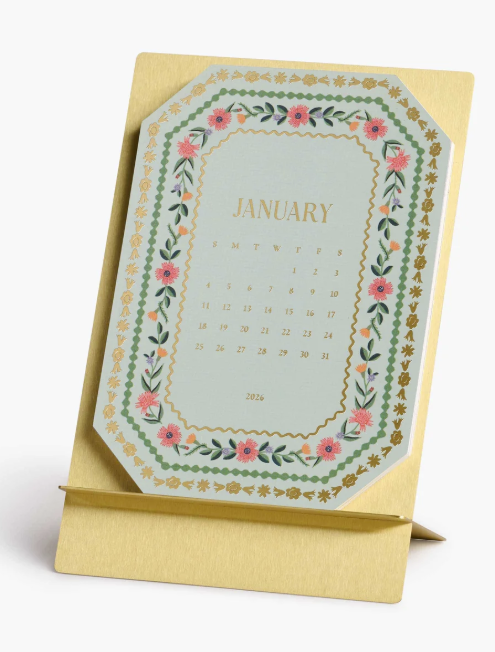 A desktop treasure, our refillable desk calendar features 12 die-cut, foil-stamped cards with original Wildwood illustrations and a brass easel for display.